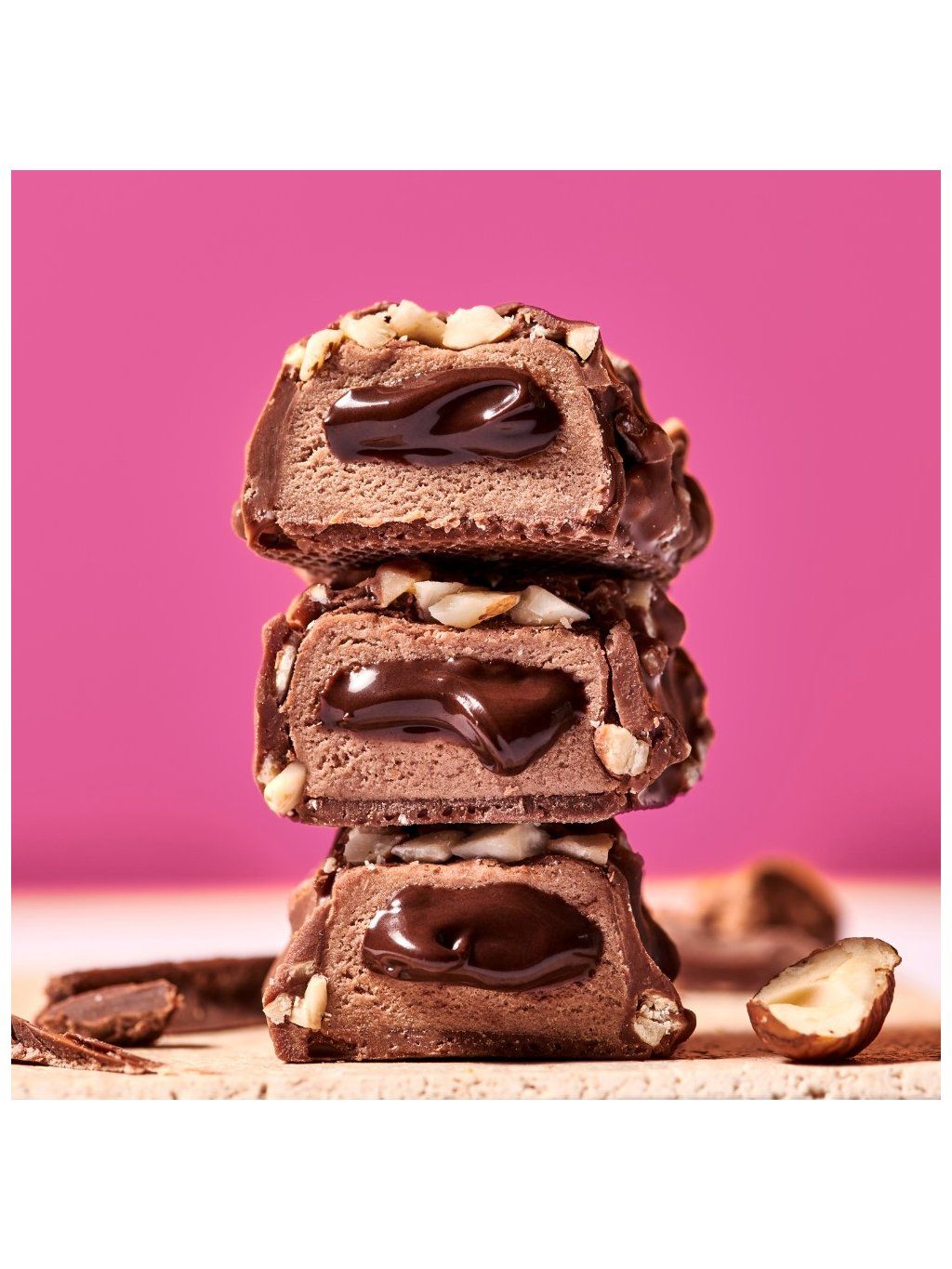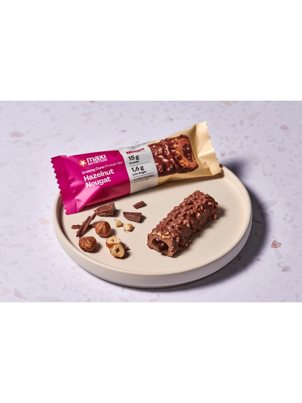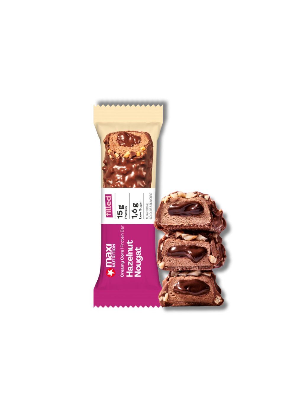 Proteinová tyčinka s 18 % krému s příchutí ořechového nugátu, 7 % pražených lískových ořechů a potažená 33 % mléčnou čokoládou. Se sladidly. Vysoký obsah bílkovin.